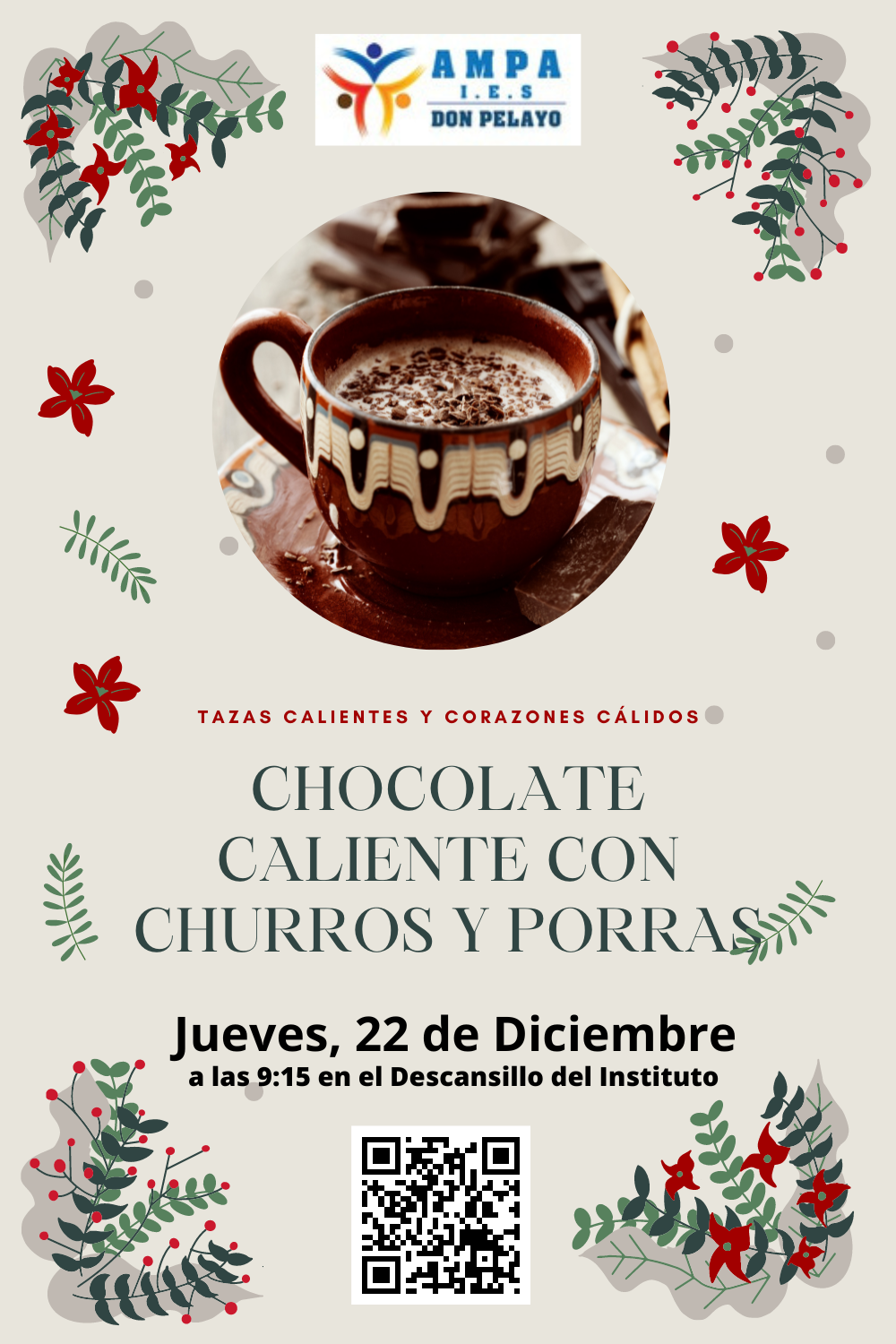 Nos complace anunciar que el AMPA, contando con el apoyo de la Directiva y Equipo Docente del IES Don Pelayo, ha decidido organizar la chocolatada con churros y porras el Jueves 22 de Diciembre, ¡una actividad muy esperada por todos!